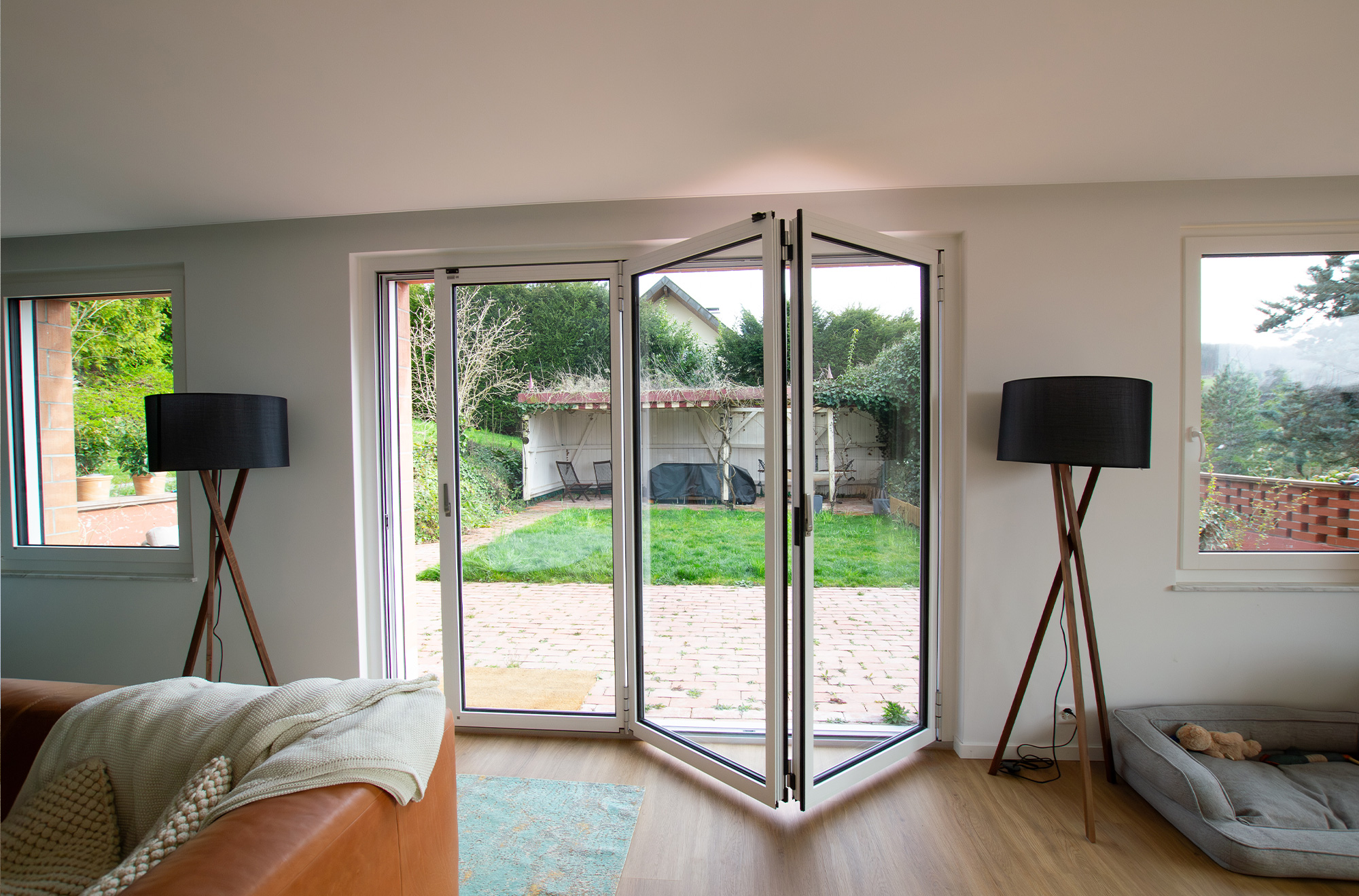 Als Verbindung zwischen Innen- und Außenbereich wurde eine Solarlux Glas-Faltwand Ecoline in weiß mit drei Glaselementen montiert. Die Konstruktion besteht aus wärmegedämmten Aluminiumprofilen, die innen und außen in Weiß gehalten sind. Die Anlage lässt sich flexibel bedienen – vollständig zur Seite geschoben entsteht eine große Öffnung zwischen Wohnzimmer und Garten, komplett geschlossen sichert sie den Wohnbereich ab und schützt vor Witterung. So entsteht ein variabler Übergang, der den Wohnraum je nach Bedarf erweitert oder abgrenzt.