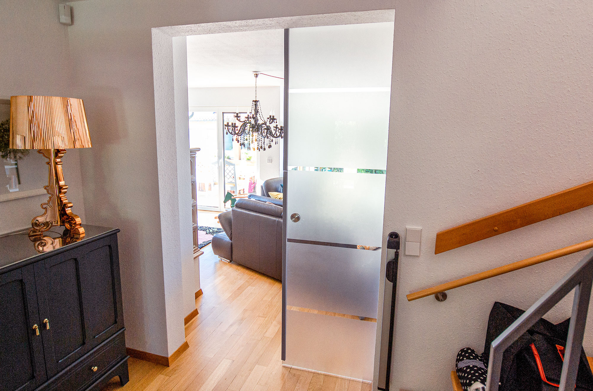 Zwischen Wohnzimmer und Gang wurde eine Glastür aus satiniertem Glas mit vier klaren, horizontalen Streifen eingebaut. Sie verbindet Transparenz und Privatsphäre und lässt gleichzeitig das Tageslicht ungehindert in beide Räume fließen. Beim Öffnen verschwindet das Glaselement dezent hinter dem Holzschrank und schafft einen offenen Übergang zwischen den Räumen.