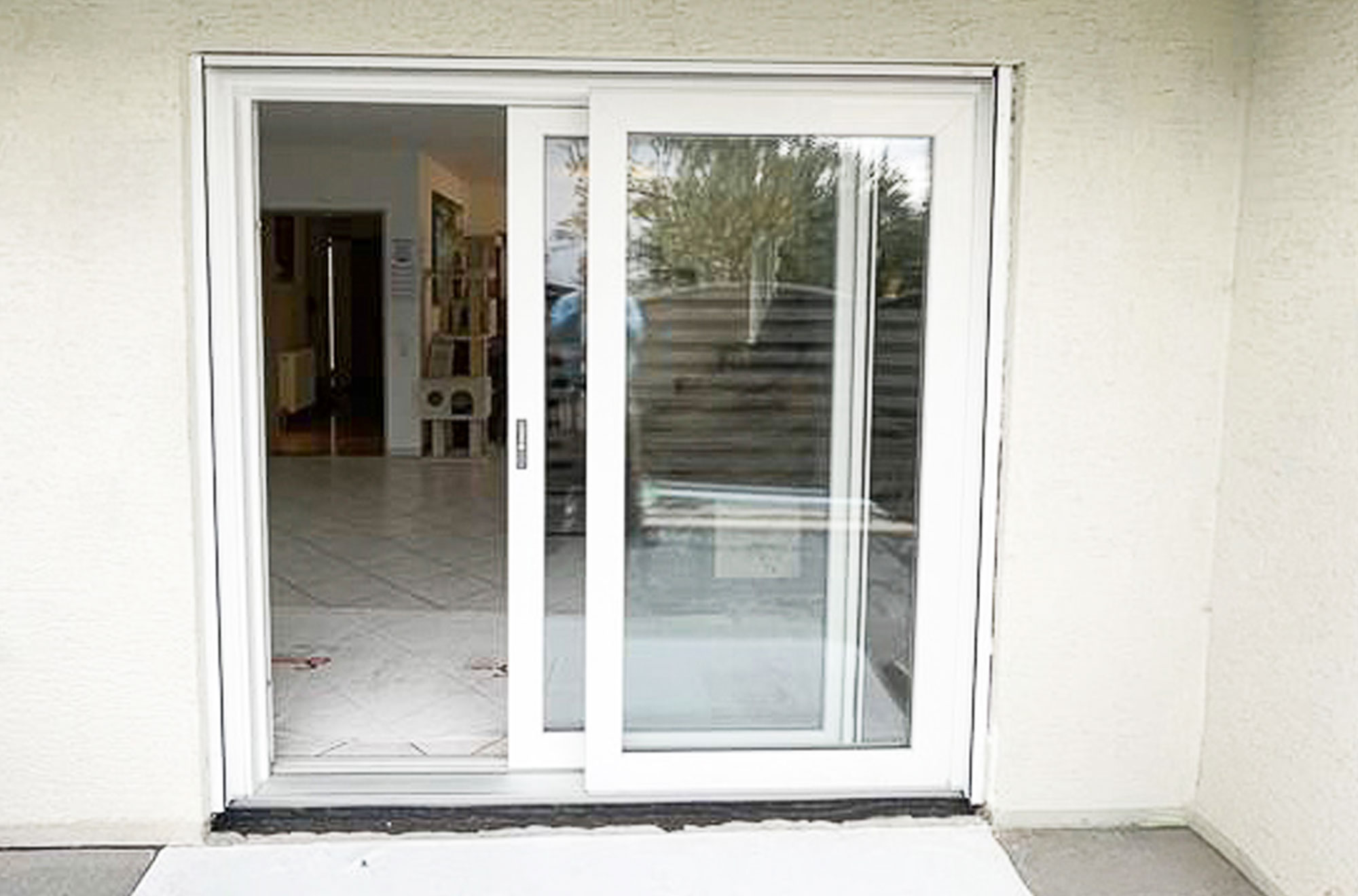 Eine neue Hebe-Schiebe-Tür aus Kunststoff verbindet das Wohnzimmer mit der Terrasse und bietet dank des im Rahmen integrierten Griffs eine komfortable, moderne Lösung. Dank der Hebe-Schiebefunktion lässt sich die Tür komfortabel bedienen. Als Verschattungsmöglichkeit wurde zusätzlich ein Rollladen verbaut, der für effektiven Sonnen- und Sichtschutz sorgt.