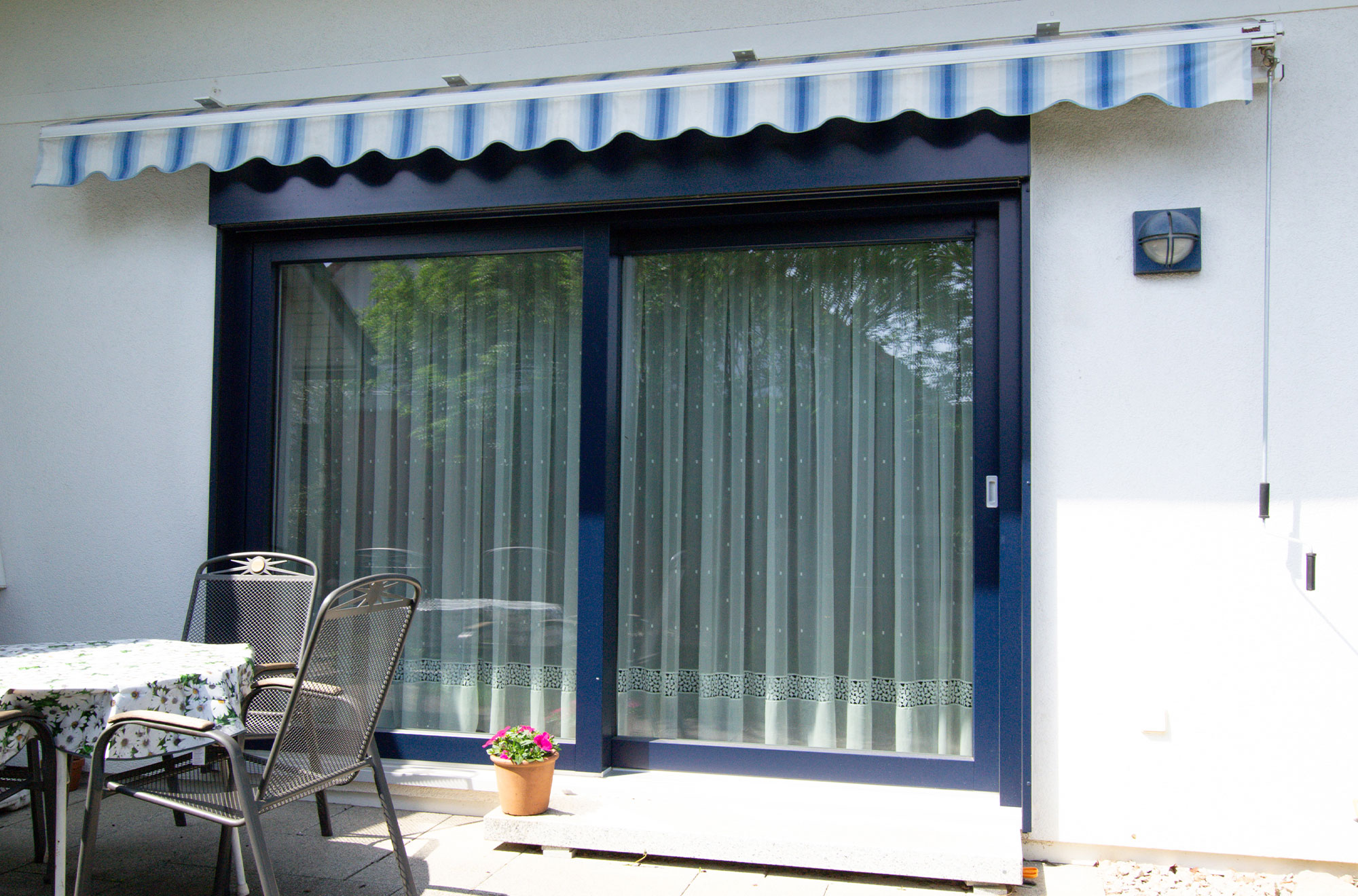 Eine Hebe-Schiebe-Tür aus Kunststoff wurde mit einer Aluvorsatzschale in Stahlblau für den Außenbereich ausgestattet und passt so optisch zu den Fenstern. Sie verbindet Funktionalität mit harmonischem Design und sorgt für einen stilvollen Zugang nach draußen.