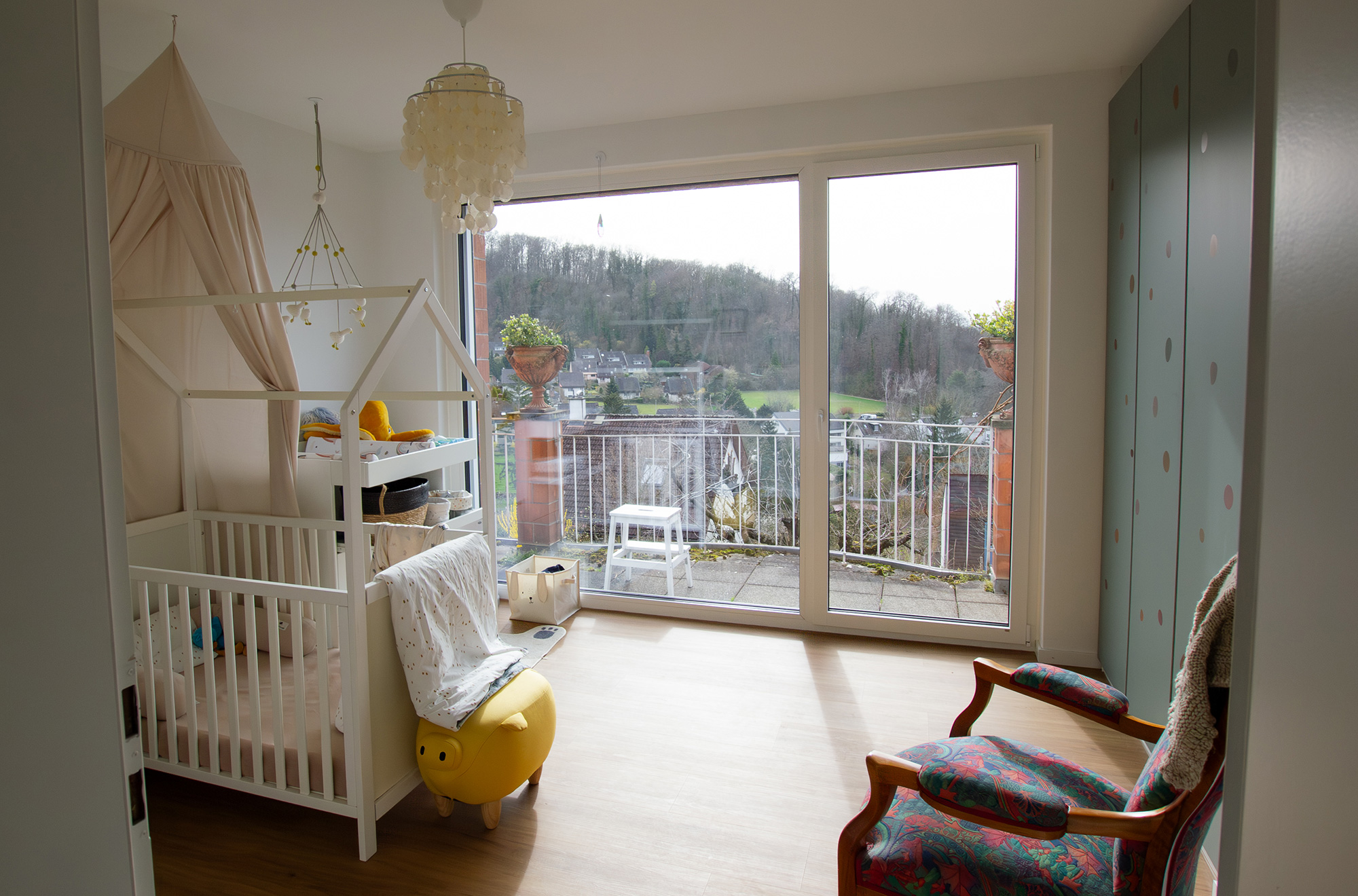 Bei diesem Projekt wurden mehrere Holz-Aluminium-Balkontüren installiert. Die Türen entsprechen dem Material- und Farbkonzept der übrigen Fensterelemente – innen weiß lackierte Kiefer, außen eine robuste Aluminiumschale. Sie ermöglichen den Zugang nach draußen und sorgen gleichzeitig für reichlich Tageslicht in den Innenräumen. So entsteht ein stimmiges Gesamtbild im gesamten Haus.