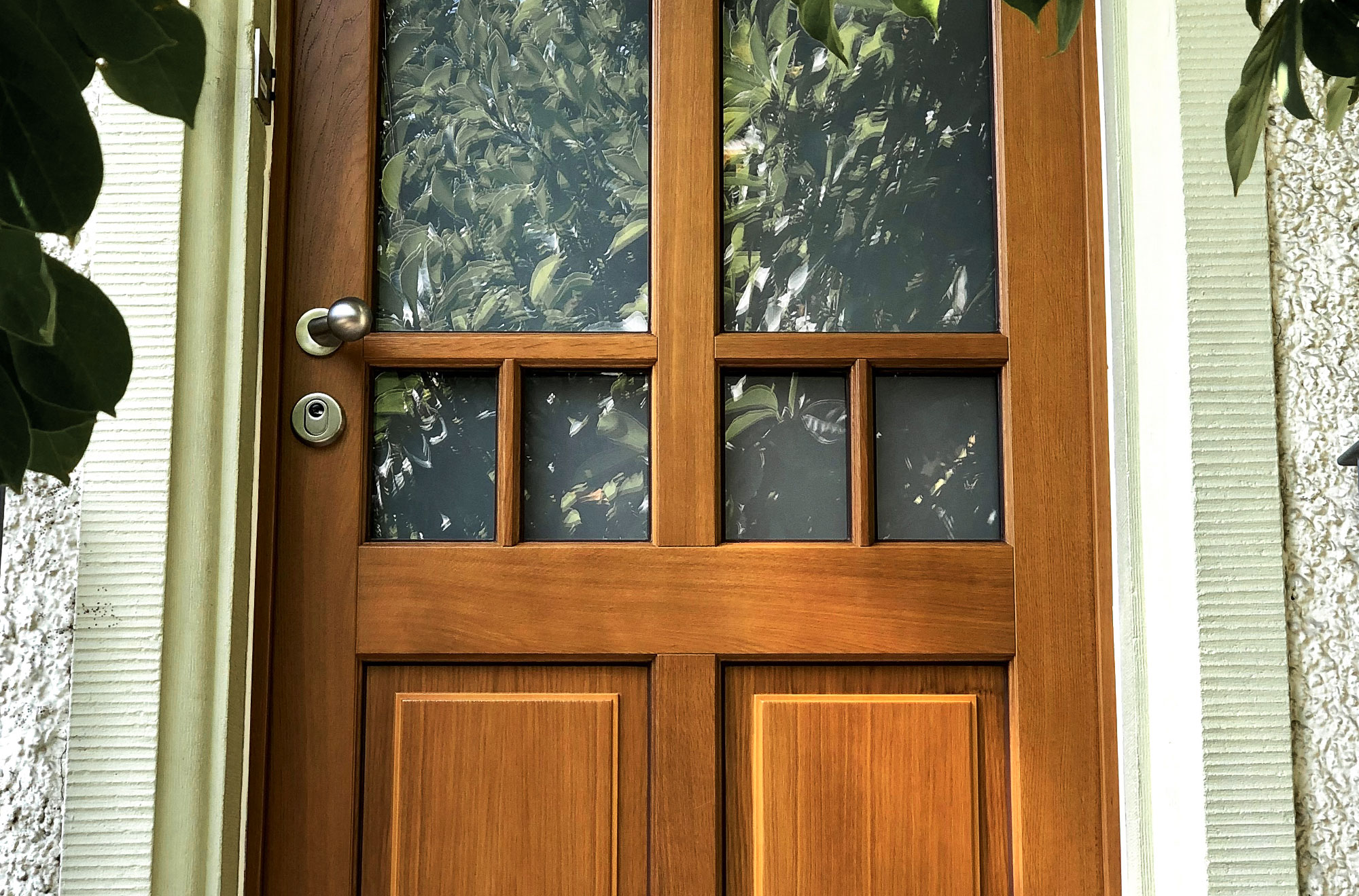 Die alte Haustür wurde durch eine massive Eichenholztür ersetzt. Im klassischen Stil mit Sprossen und satiniertem Weißglas gestaltet, verbindet sie traditionelle Optik mit moderner Technik durch einen integrierten Fingerscan.