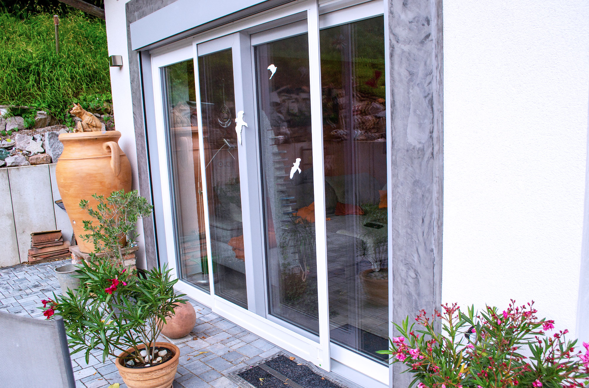 Die Hebe-Schiebe-Tür ist mit einer passgenauen, weißen Insektenschutz-Schiebetür ausgestattet, die sich harmonisch ins Gesamtbild einfügt. Sie lässt sich leichtgängig nach rechts und links verschieben und ermöglicht so ein komfortables, ungestörtes Lüften bei geöffnetem Türelement. Dezente Vogelschutzaufkleber ergänzen das Design unauffällig.