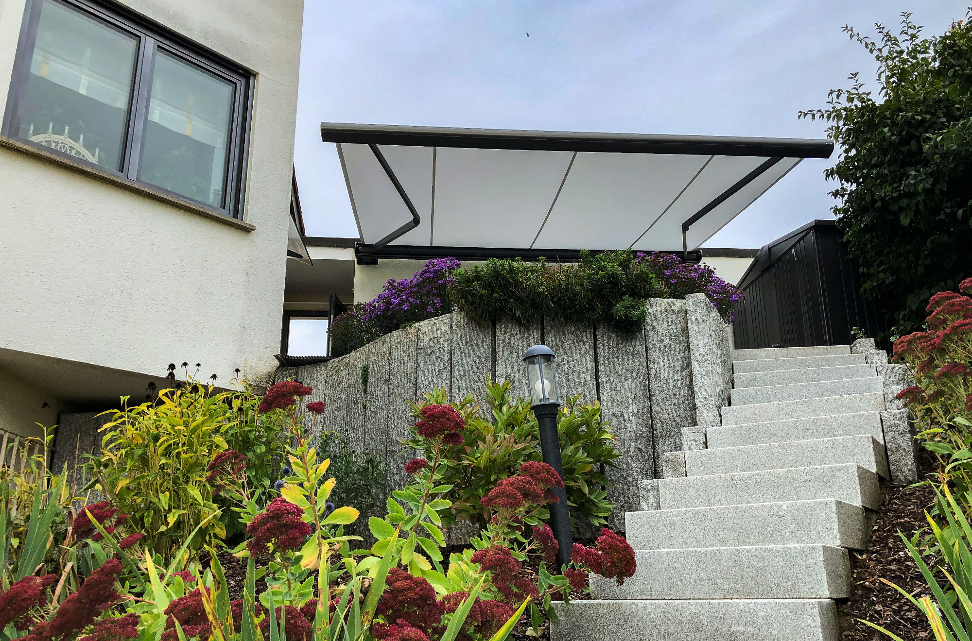 Eine neue Kassettenmarkise in Anthrazit-Eisenglimmer wurde angebracht. Mit 3 m Breite und 2,5 m Ausfall bietet sie großzügigen Schatten für die Terrasse und den Essbereich. Dank Motorantrieb lässt sie sich bequem steuern und schützt zuverlässig vor Sonne und Wärme.