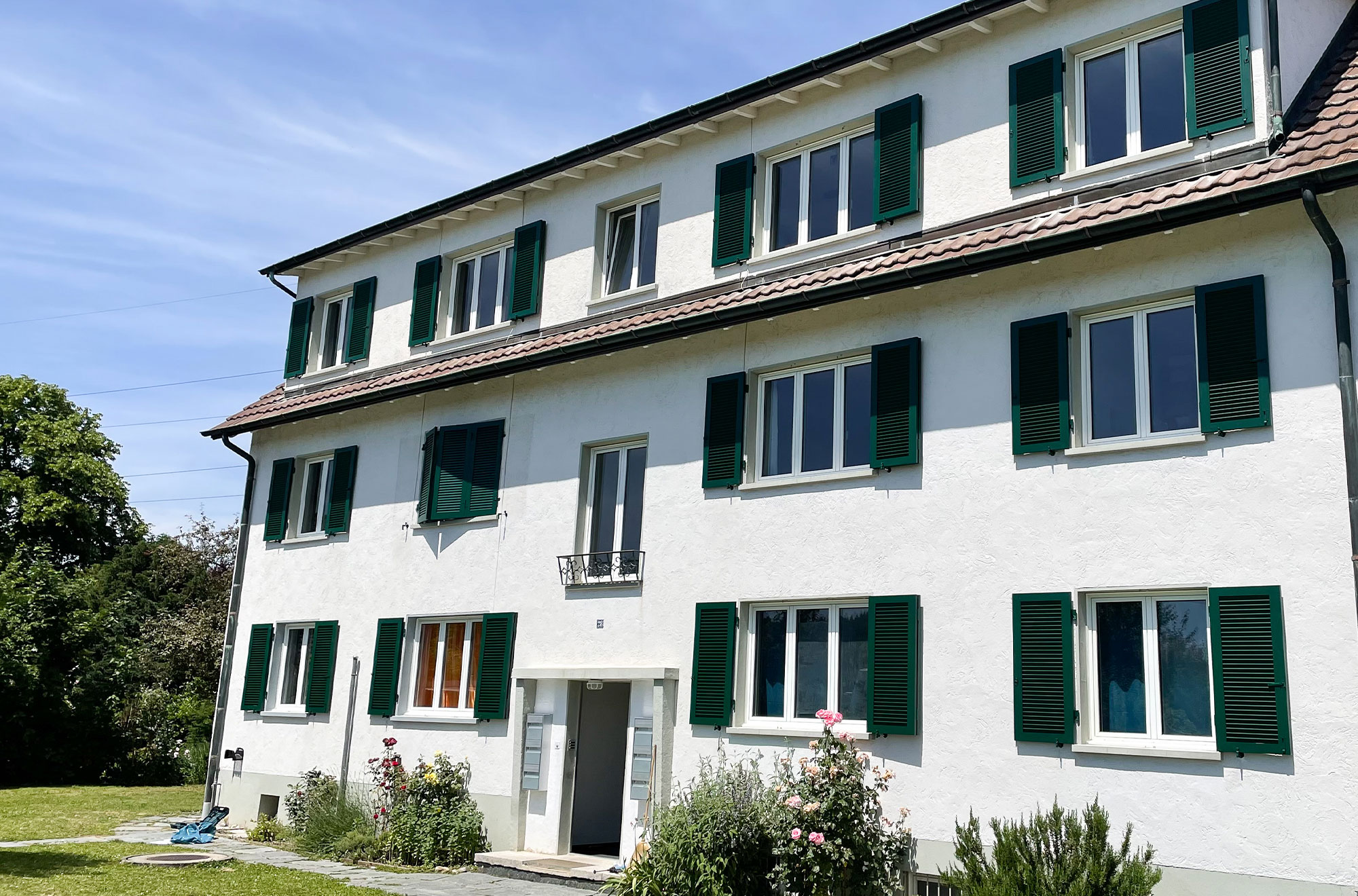 Die alten Klappläden wurden durch neue ersetzt, deren Tannengrün sich harmonisch in das Farbkonzept der Fassade einfügt. Sie verbinden Funktionalität mit einem ästhetischen Auftritt und werten das Gebäude optisch spürbar auf.