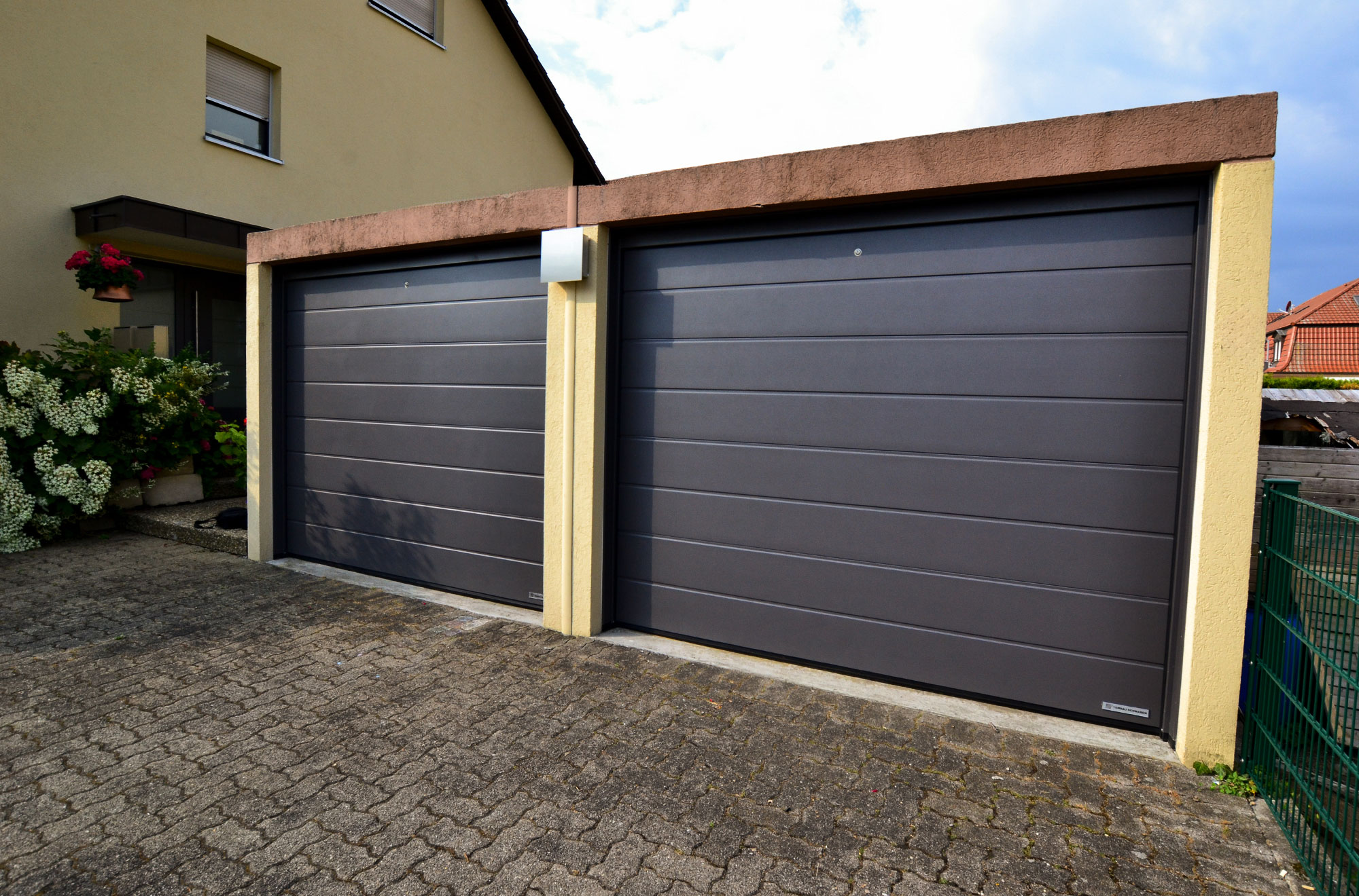 Die alten Tore wurden durch zwei nebeneinanderliegende Sektionaltore in Anthrazit mit feinem Metallic-Schimmer ersetzt. Die Tore öffnen platzsparend ohne Öffnungswinkel. Regen und Schmutz bleiben zuverlässig draußen. Finger- und Klemmschutz sorgen zusätzlich für Sicherheit.