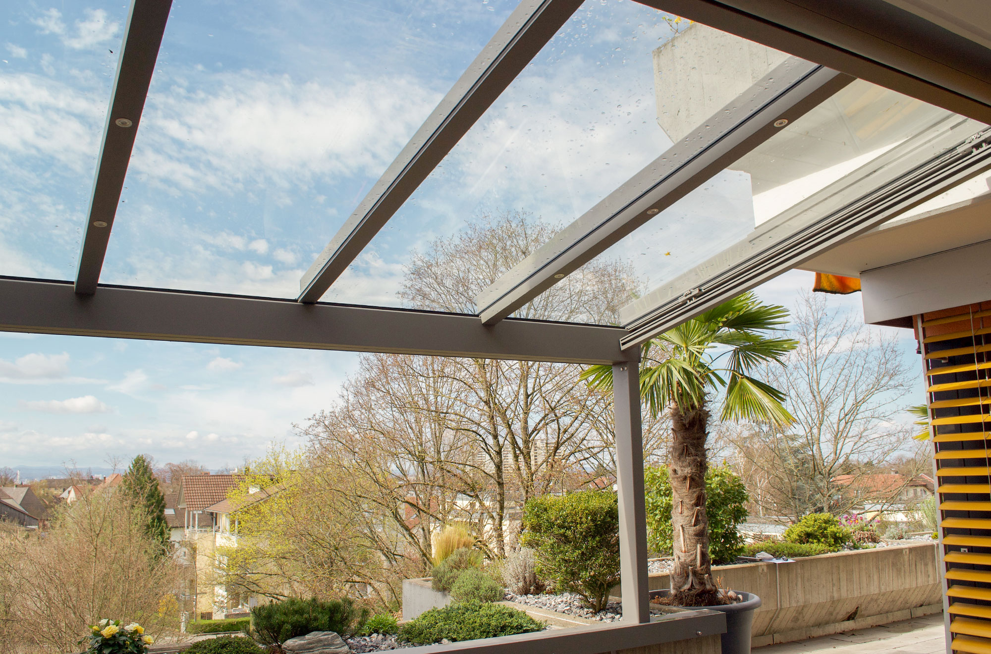 Auf dem Balkon wurde ein Solarlux Überdachungssystem SDL-ATRIUM montiert, das als Pultdach mit Dachüberstand ausgeführt ist. Die Konstruktion besteht aus Aluminium-Profilen und Verglasungen aus klarem VSG-Sicherheitsglas, die zuverlässig vor Regen und Witterung schützen. Das System verfügt über einen rückseitigen Wandanschluss sowie eine Speierrinne für die kontrollierte Wasserableitung.