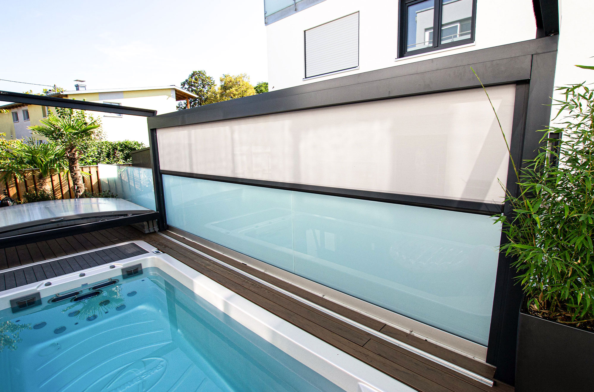Ein hellgraues Textilscreen wurden auf der Terrasse mit Pool installiert, um die Privatsphäre zu schützen. Sie dienen gleichzeitig als praktische Verschattungsmöglichkeit. So entsteht ein komfortabler und geschützter Außenbereich zum Entspannen.