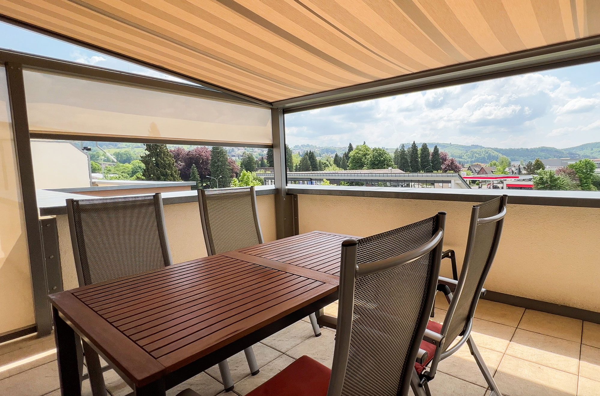 Drei helle, lichtdurchlässige Textilscreens bieten rundum wirksamen Schutz vor tief stehender Sonne und Blicken von außen. Durch ihre helle Fargebung bleibt der Blick nach außen erhalten. Die elektrisch steuerbaren Textilscreens lassen sich bequem positionieren und schützen so bei Bedarf den gesamten Balkon.